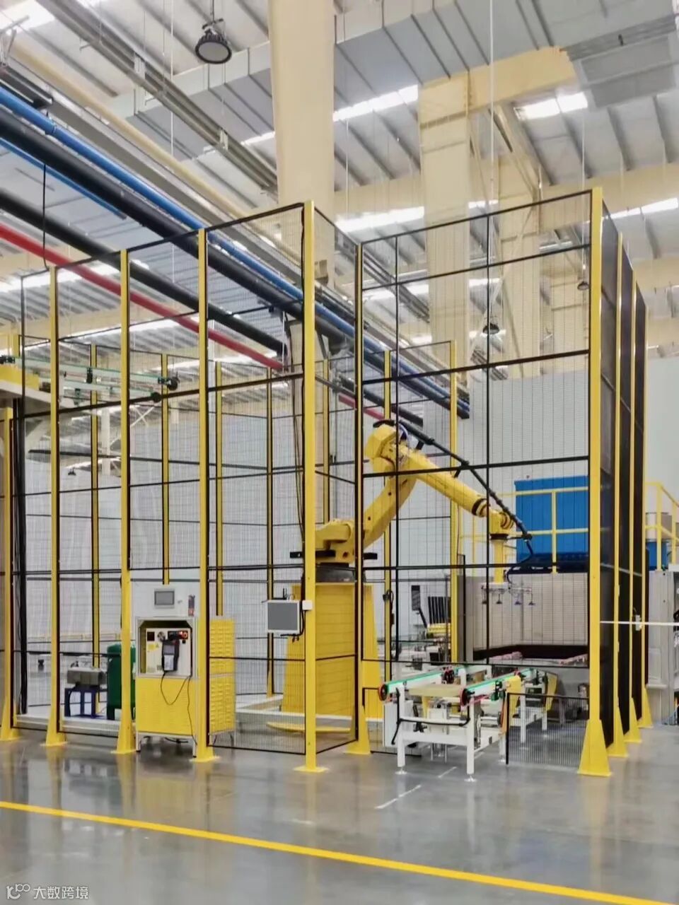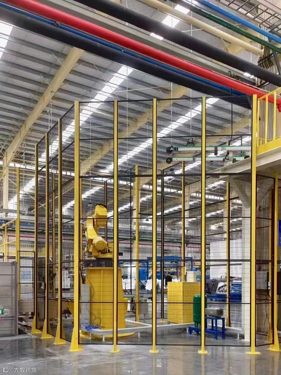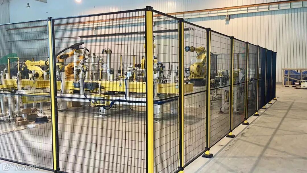 该项目是为某玻璃企业安装安全围栏产品,运用于机器人防护。围栏根据设备需求设计不同高度,其中最高的围栏总高度有5.5米,采用三网板拼接,网板与立柱用螺栓对穿拼接的形式,高度原因立柱底板也重新定制做了更好的支撑。