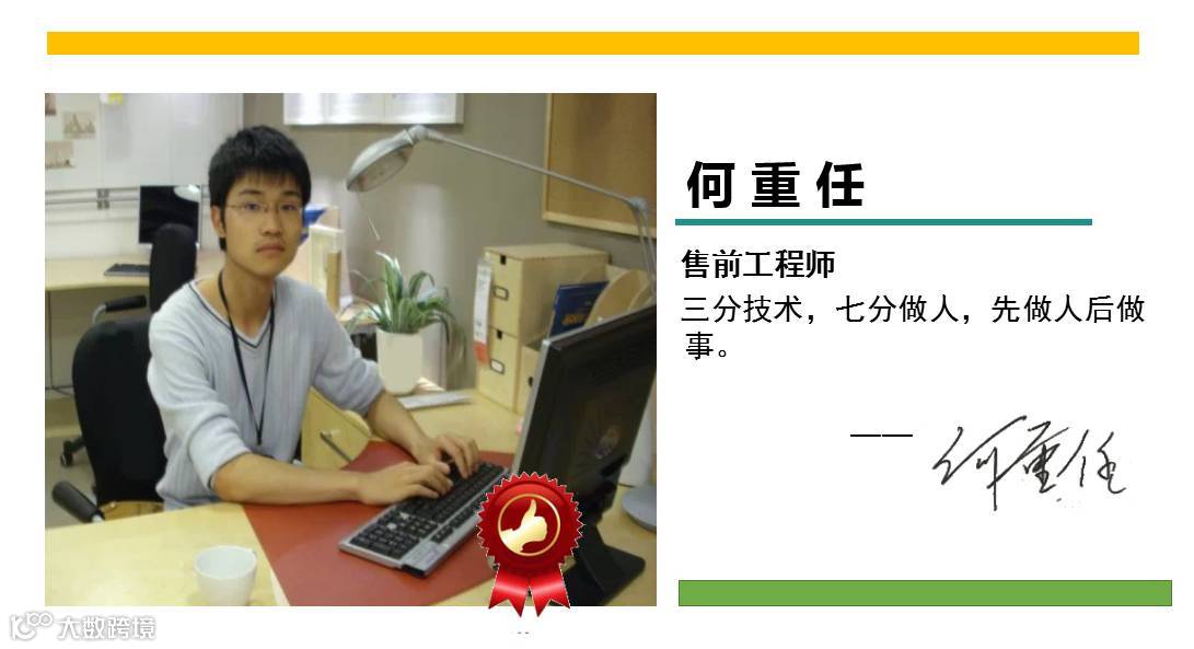 何重任工作认真负责,积极主动,能吃苦耐劳。担任售前工程师以来,迅速适应各种环境,用过硬的技术、真诚的态度、超强的责任心,赢得了广大客户的认可,为每一个项目的落地与实施做好了保驾护航。