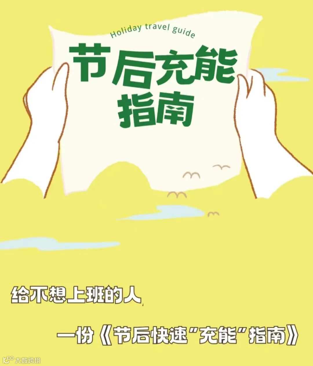 6.为自己下一次的旅行选择备选目的地,给自己一个期待:假期过后,出现"假期综合症"是很正常的,不要给自己太多压力,工作之余也要记得定期给自己“充能”。