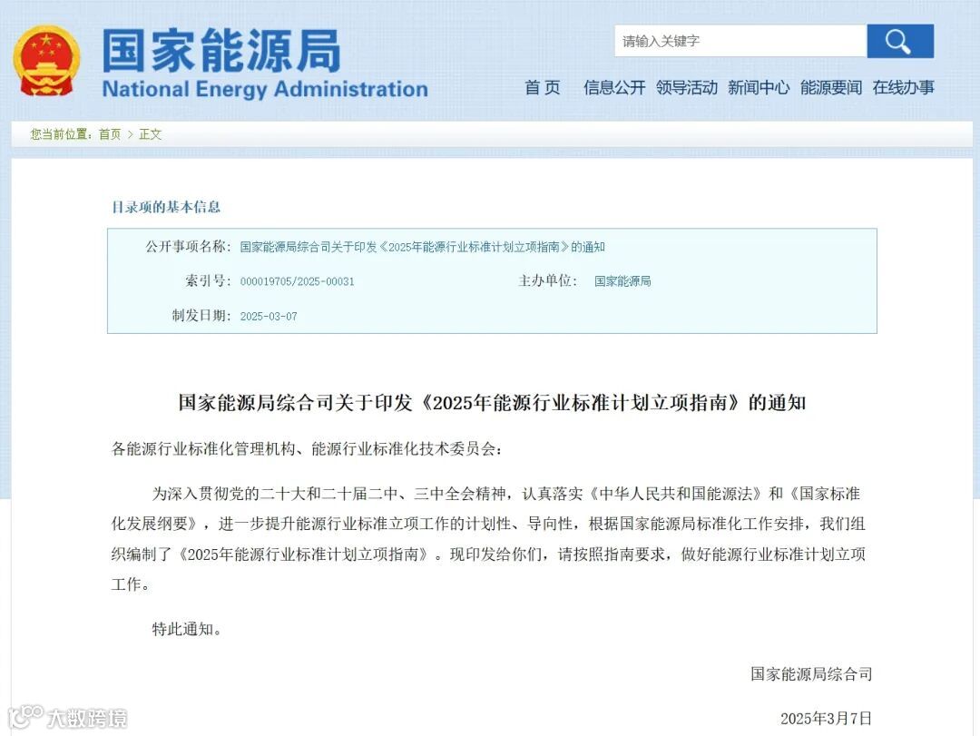 国家能源局综合司关于印发《2025年能源行业标准计划立项指南》的通知