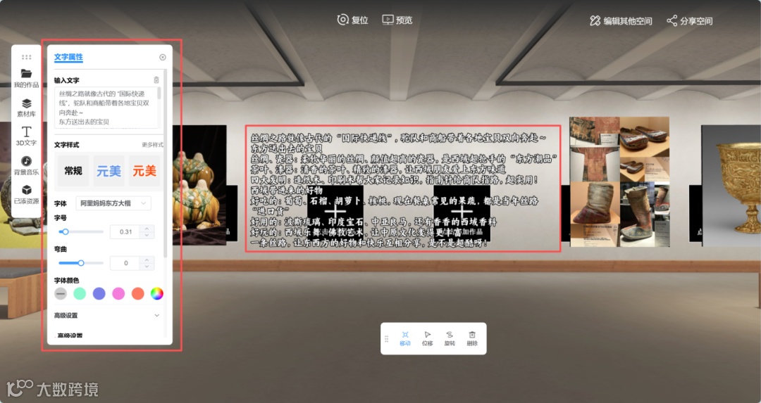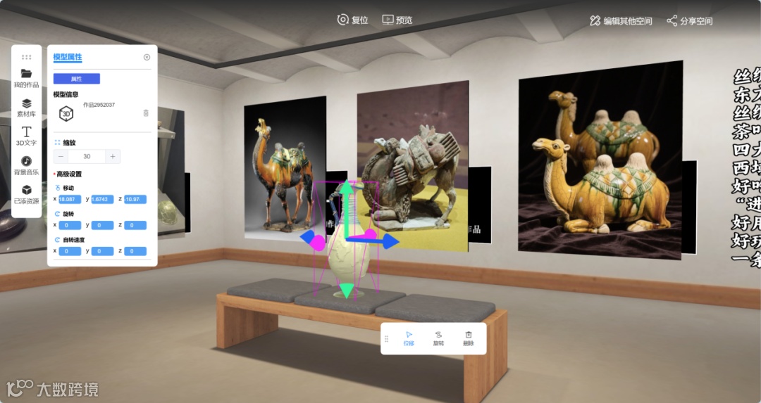 3D模型成功下载至电脑本地后,打开元美名片网页版,即可在后台上传该模型素材。进入展厅编辑界面后,还能根据教学展示需求,灵活调整模型的大小比例与空间摆放位置,让模型与丝路主题展厅的整体场景更适配。