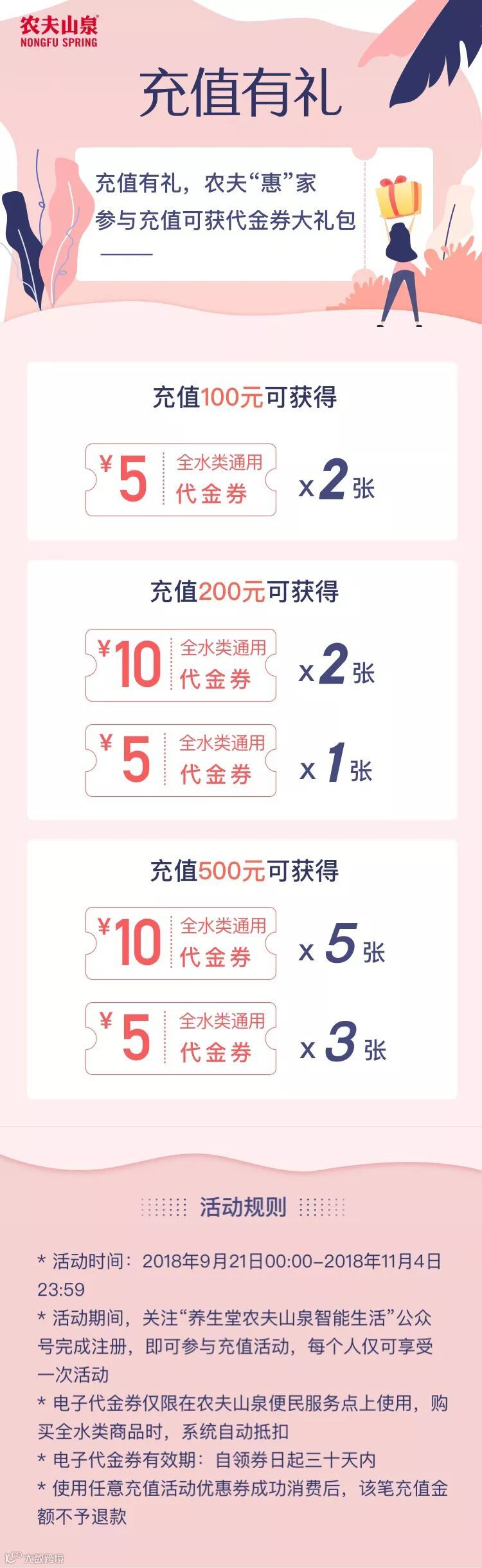 *活动期间可在活动界面参与国庆抽奖活动,关注“养生堂农夫山泉智能生活”公众号完成注册即可领取优惠券。