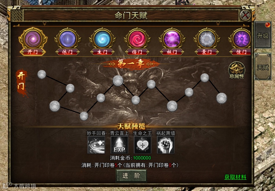 消耗天赋卷轴材料,可以解锁章节,并获得命门技能。