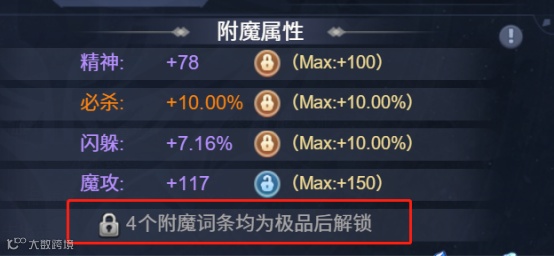 第5个附魔位可附魔出专属稀有极品属性“抗必杀”,橙色效果8%抗必杀。