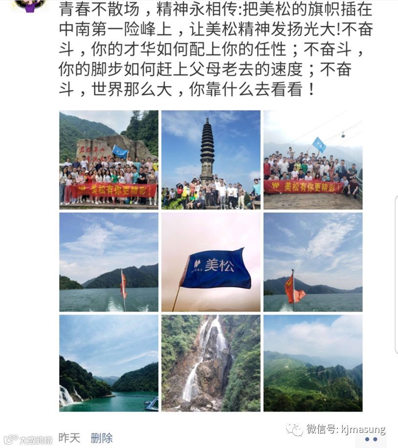 第二站,【天台山景区】。山峰、石林、奇树、古寺、云海、日出、高山杜鹃的杰出代表。石板路依山势铺就,使您感受到"漫步天台登山道,肆意纵横天地间"的磅礴之势,因酷似张家界,而被游客称为湖南第二张家界,为莽山最漂亮的景区。在登莽山的过程中,大家惊叹天台山奇石、奇峰、险崖的雄伟奇险景观,“一览众山小”的壮阔风景美不胜收。同事们热情高涨,由最初的心惊胆战,最后都做到了山高人为峰,莽山如何被我等征服,把美松的旗帜插在中南第一险峰上,让美松精神发扬光大!是的,美松人不服输,正如同事coco的朋友圈所言: 不奋斗,你的才华如何配上你的任性;不奋斗,你的脚步如何赶上父母老去的速度;不奋斗,世界那么大,你靠什么去看看!