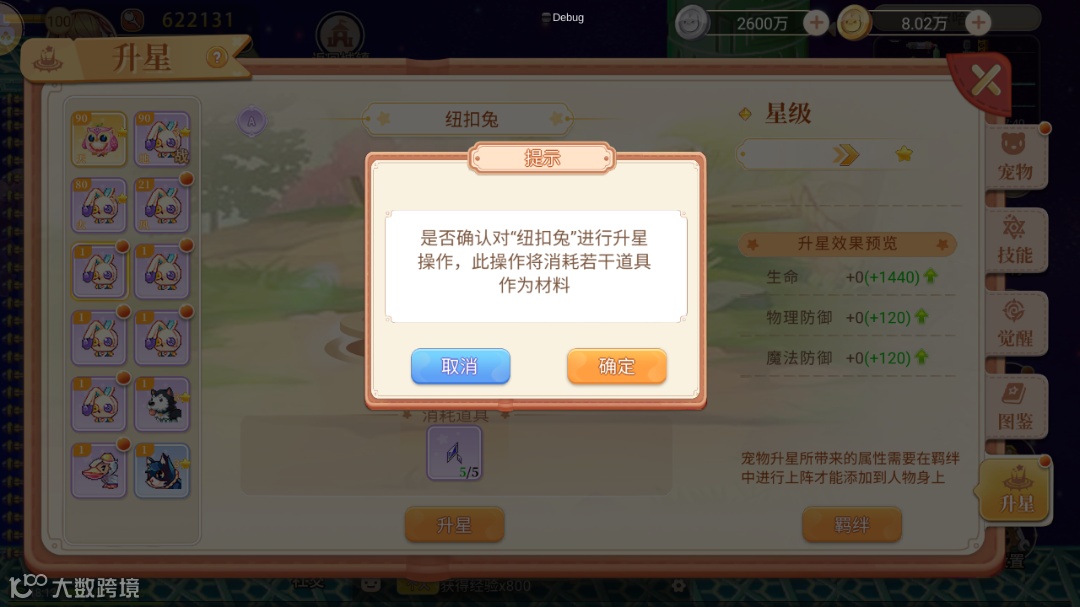 如放生哈士奇获得5个紫色碎片,可以给纽扣兔升星。