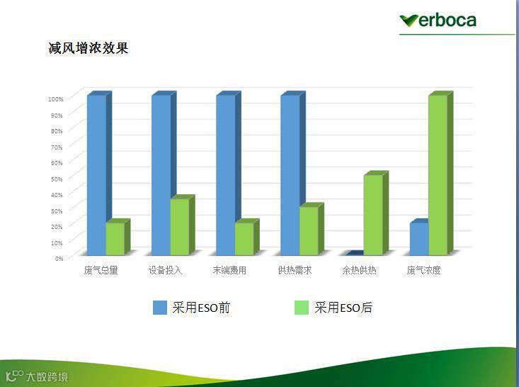 ESO能取代凹印机和干法复合机的热风干燥装置,可实现大幅度减风节能增浓,废气总量下降浓度上升后,末端处理设备的投入大幅度下降,风机能耗降低,助燃的燃料损耗减少,同时末端处理设备还具备余热供热能力,增加余热供热系统通过热水等介质将余热送回ESO用于热风干燥,结合ESO强大的节能功能,在大多数情况下,余热完全可以满足软包企业各种供热的需求,为企业节约非常可观的能源费用,从而产生巨大的经济效益。