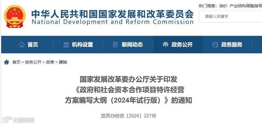 国家发展改革委办公厅关于印发《政府和社会资本合作项目特许经营方案编写大纲(2024年试行版)》的通知