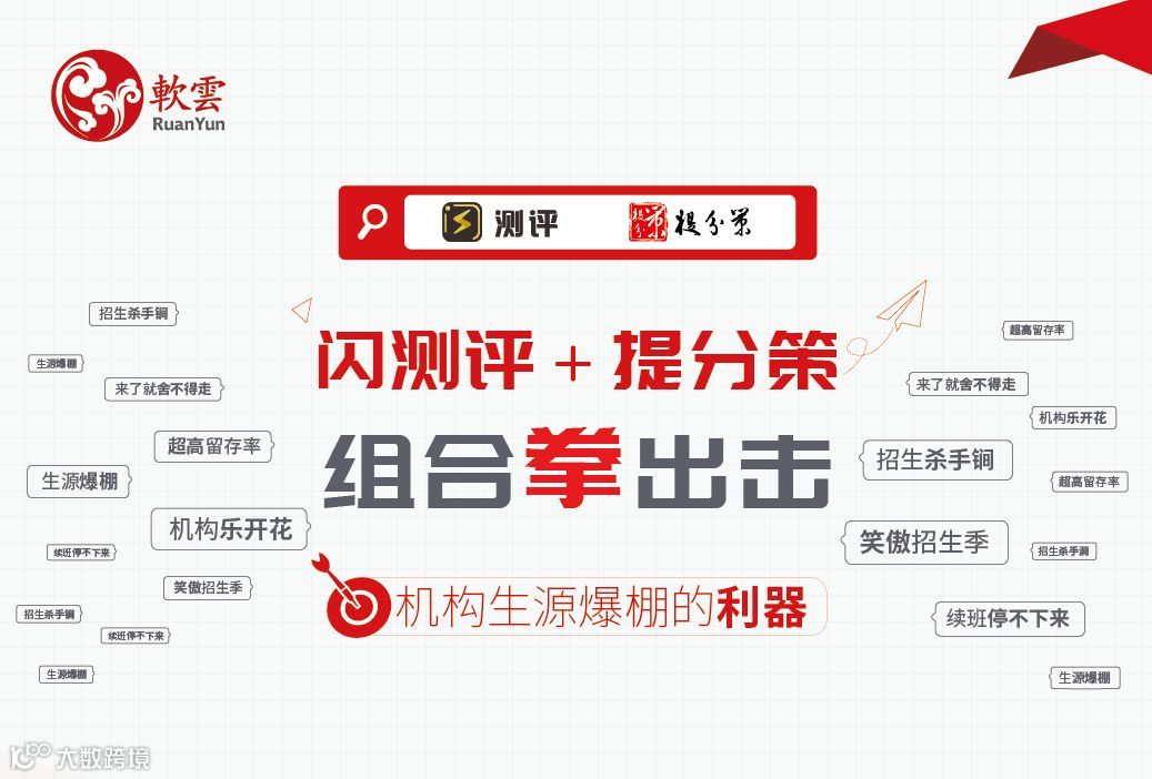 精准瞄定当前教育培训机构的“生源匮乏”难题,软云科技给出了从引爆新生到稳固老生的一站式解决方案——闪测评+提分策组合套餐,助力机构生源爆棚。