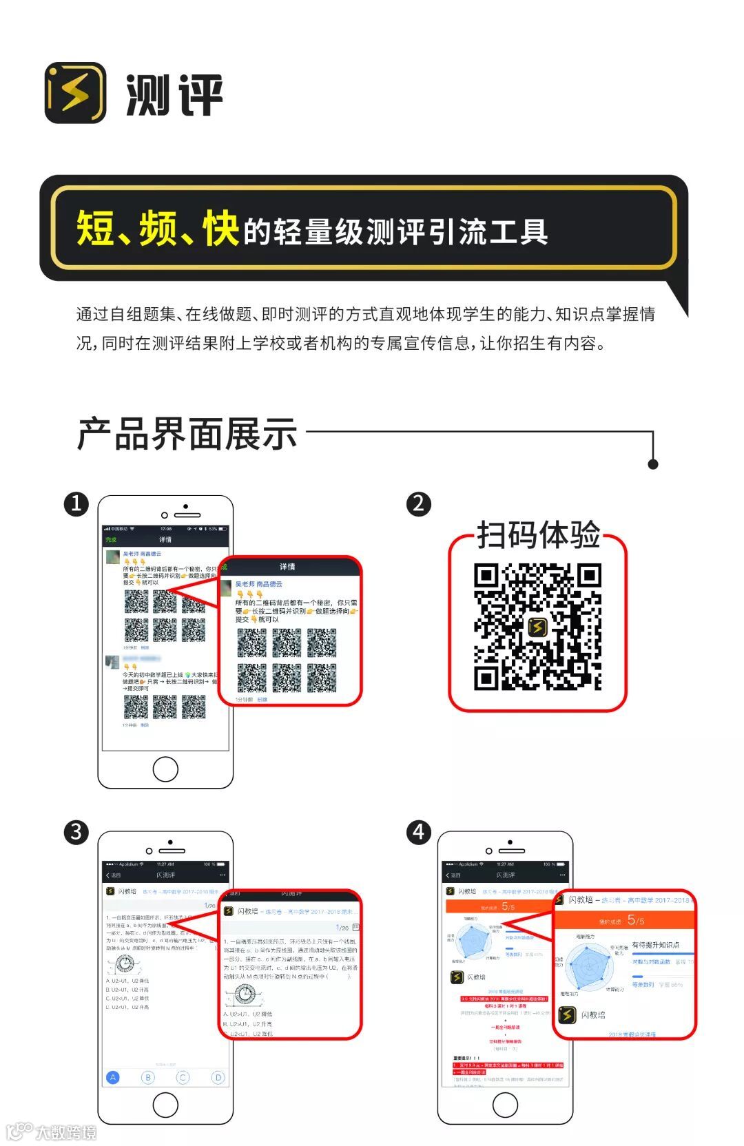 闪测评是一款短、频、快的轻量级测评工具,主要应用于教培企业的招生入口,以自媒体为渠道,社区为手段,高效率、低成本获取意向生源数据信息,建立丰富蓄水池,上门到访不用愁;