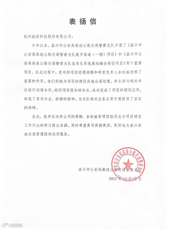 近日,诚道科技陆续收到了兵团公安局交警总队、内蒙古自治区公安厅交通管理局车辆与驾驶人管理支队、湖南省高速公路交通警察局、衢州市公安局交通警察支队、嘉兴市公安局高速公路交通警察支队等客户单位的表扬信,信中对公司项目团队和个人进行了表扬。他们坚守在最前线,以客户为中心,全心全意为客户提供优质服务;面对困难和挑战时,展现出了诚道人卓越的敬业精神和执行力,为客户相关业务正常开展提供了坚实保障,也为我司赢得赞誉。