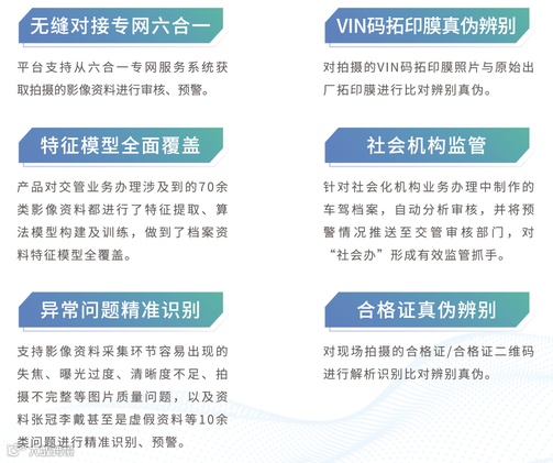 档案智能审核平台是用来辅助业务审核人员,解决日常档案影像审核过程中,档案采集不规范、不清晰、档案照片张冠李戴等问题。产品利用深度学习技术对各类档案影像资料进行特征提取、建模、比对审核,对异常情况提示预警,有效地提高车管所审核人员的审核效率,降低人工成本。