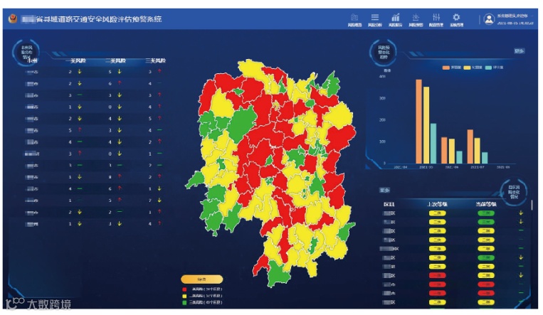 县域道路交通安全风险防控是实现“坚决杜绝重特大道路交通事故,坚决遏制较大道路交通事故”工作目标的关键环节。县域道路交通安全风险评估预警系统通过“事故类、基础类、管理类”等风险类别以及各类相关风险评估维度,对县市区的道路交通风险进行评估,实现交通安全风险总体态势的综合评价,形成风险动态跟踪和滚动排名。系统根据风险评估维度值变化进行相应的预警,使各级交管部门清晰掌握辖区当前风险安全治理的形势,为其及时把握安全风险管理的薄弱区域和薄弱环节提供科技支撑。