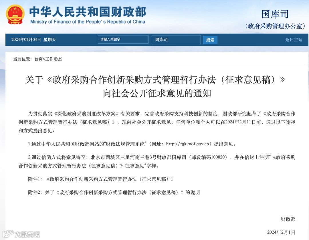 为贯彻落实《深化政府采购制度改革方案》有关要求,完善政府采购支持科技创新的制度,财政部研究起草了《政府采购合作创新采购方式管理暂行办法(征求意见稿)》,现向社会公开征求意见。任何单位和个人可以在2024年2月11日前,通过以下途径和方式提出意见: