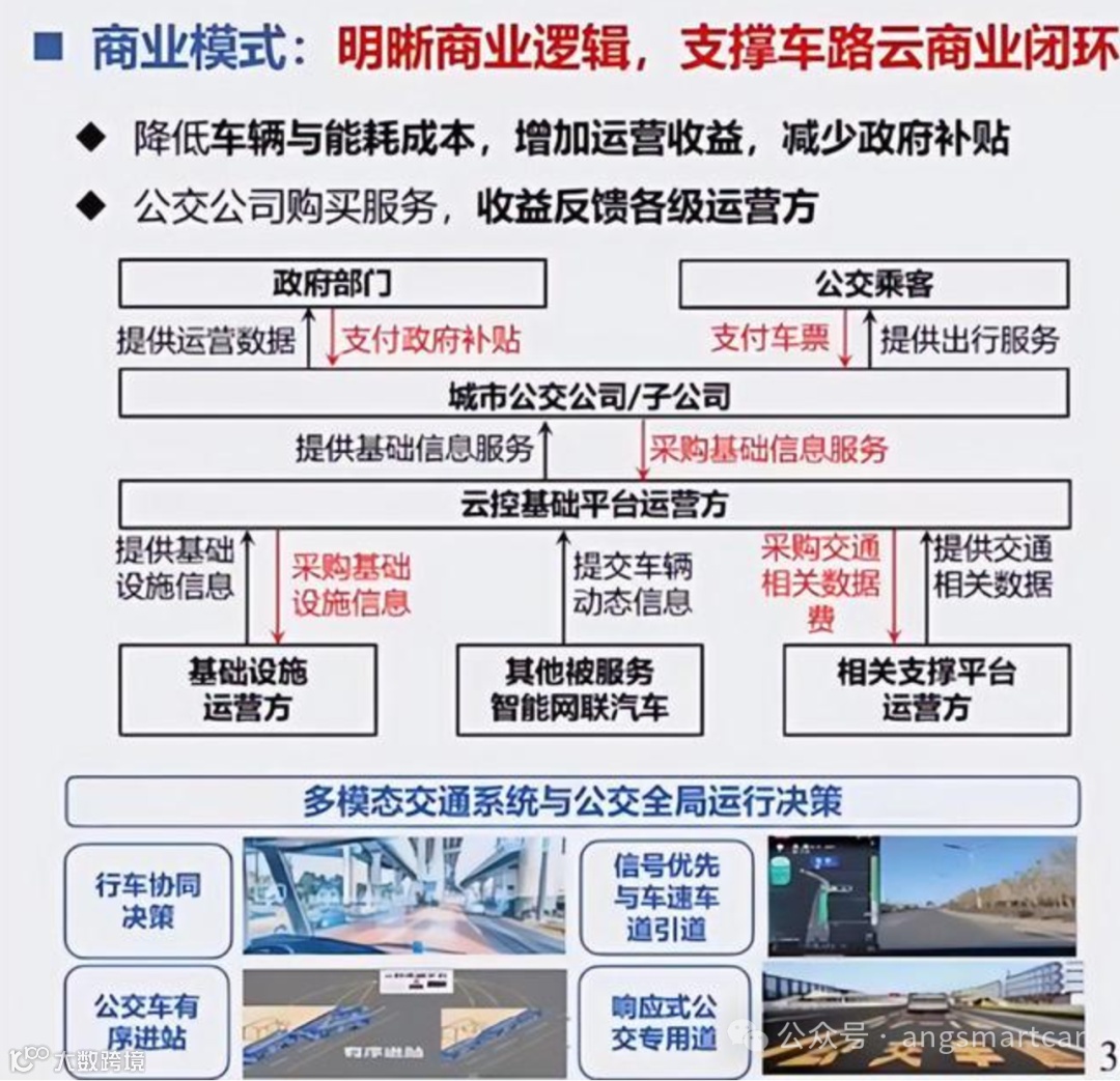 若采用车路云一体化系统,可以建立柔性的数字化轨道运行,效率真正意义上提升。天津示范提高交通通行效率30%,苏州示范节能提高10%。5G智联车公众号(ID:angsmartcar)了解到李克强院士指出公交公司、运营公司等都可以在同一云控基础平台下工作,降低车辆能耗成本、增加运营收益,形成完整的具有商业闭环的应用场景。