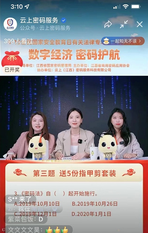 截至2022年4月底,云上密码公司已为“赣服通”“赣政通”“智慧赣粮”等53个业务信息系统提供密码应用服务保障,其中17个信息系统顺利通过商用密码应用安全性评估。