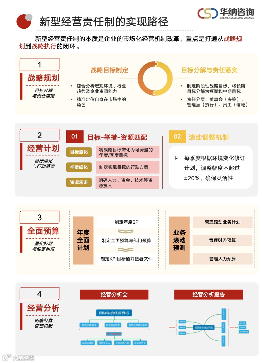 4、战略与执行的闭环协同:企业制定清晰且具有前瞻性的战略目标,将其细化为具体的经营计划和预算安排,在执行过程中,通过定期的经营分析和绩效考核,及时发现问题并调整策略,确保战略目标的顺利实现。