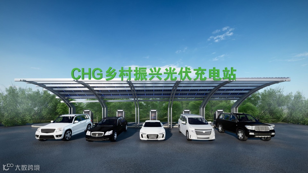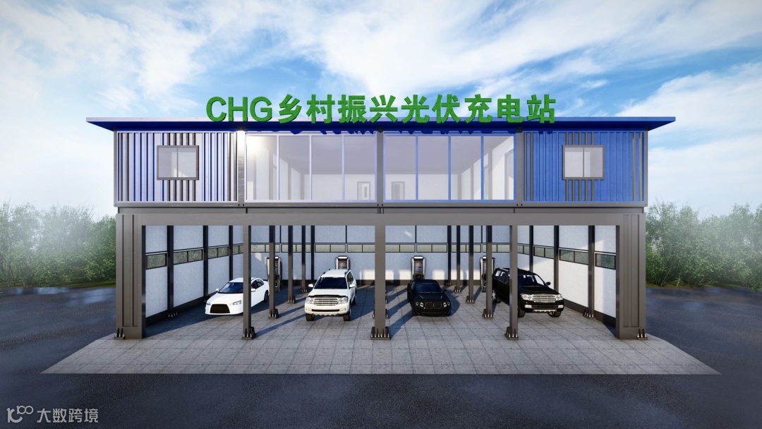 户外设有CHG屋顶光伏充电站,是区域内小规模充电站。每个有4-5个充电终端,日均为300余辆车提供充电服务。
