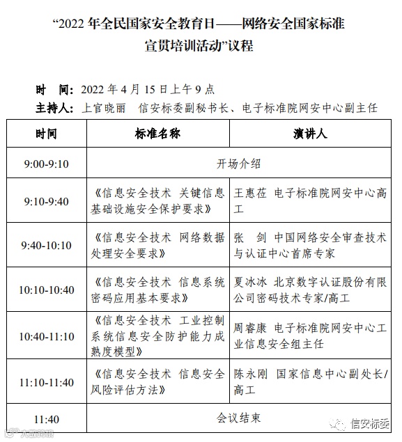 附件:“2022年全民国家安全教育日——网络安全国家标准宣贯培训活动”议程