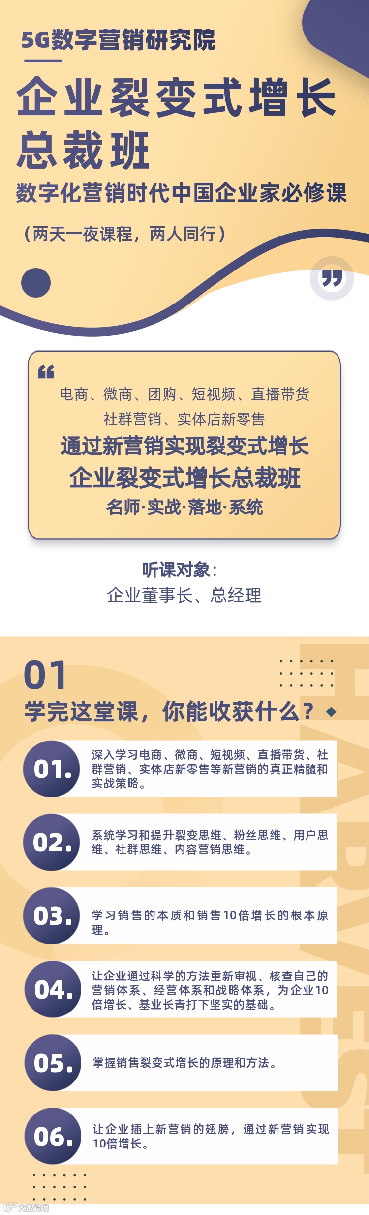 5G数字营销研究院精心打造的《企业裂变式增长总裁班》,能够帮助电商、微商、团购、短视频、直播带货、社群营销、实体店新零售