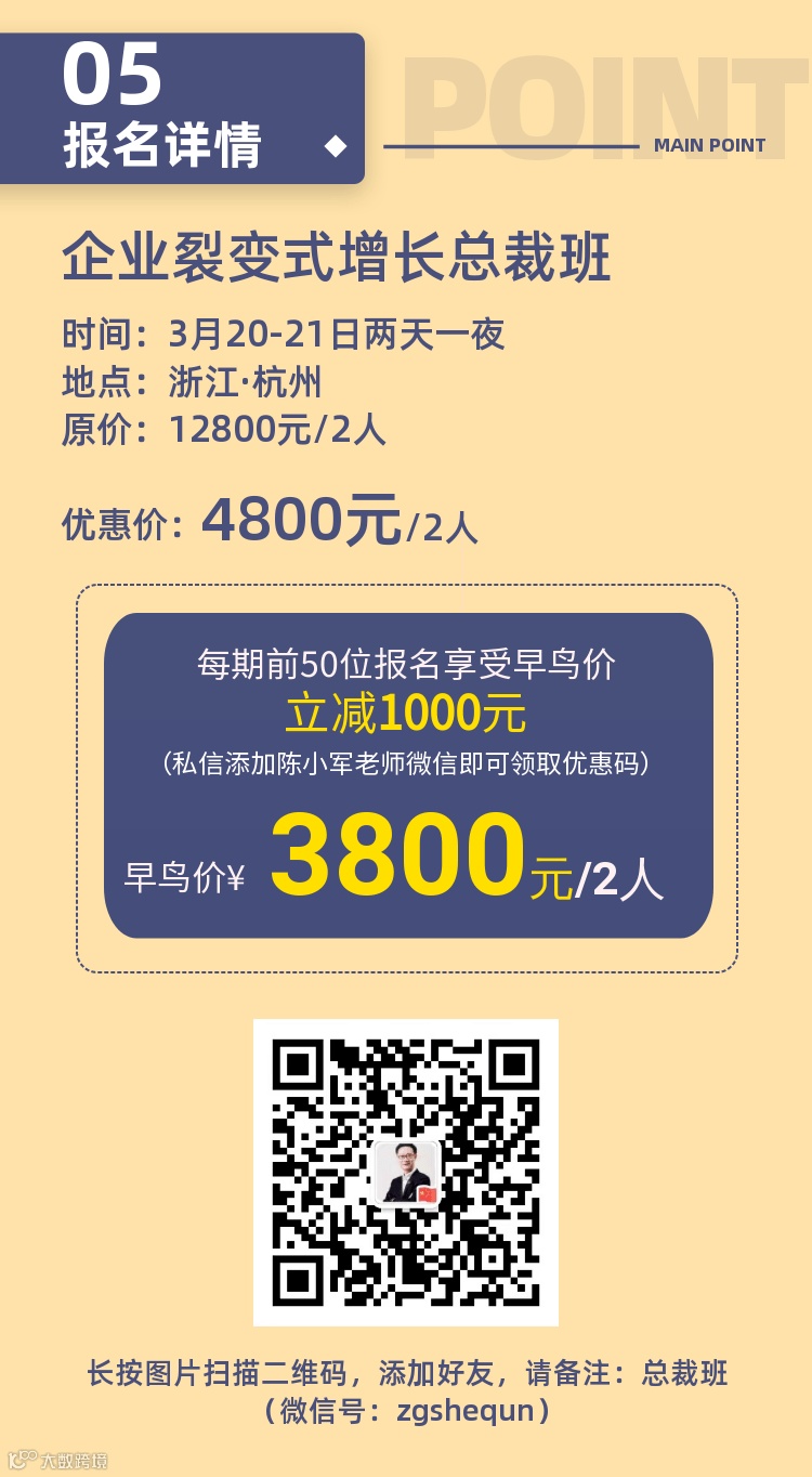立刻报名添加陈小军老师微信:zgshequn(请备注:总裁班)
