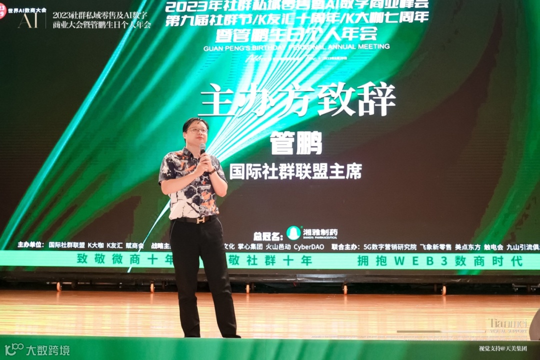 作为本次大会的主办方代表,国际社群联盟主席管鹏在开幕致辞中表达了对微商和社群行业发展的致敬。管鹏指出,过去十年间,微商和社群行业经历了蓬勃发展,为零售行业带来了重大的变革。同时,他也强调了拥抱WEB3数商时代的重要性,鼓励与会者在数字化和智能化的浪潮中积极探索。