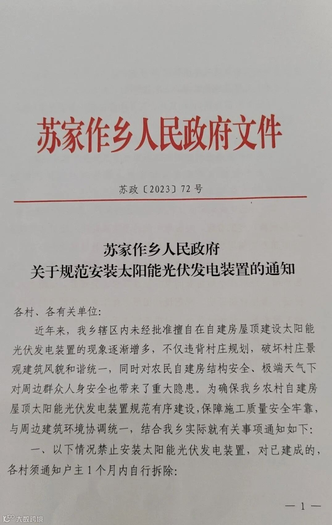 8月29日,河南省焦作市苏家作乡人民政府发布关于规范安装太阳能光伏发电装置的通知,通知指出: