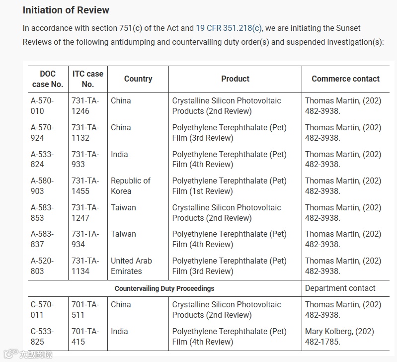 2014年1月23日,美国商务部对进口自中国的晶体硅光伏产品发起反倾销和反补贴调查,对进口自中国台湾地区的晶体硅光伏产品发起反倾销调查。2015年2月18日,美国商务部正式对进口自中国的晶体硅光伏产品发布反倾销和反补贴征税令,对进口自中国台湾地区的涉案产品发布反倾销税令。2020年1月2日,美国商务部对进口自中国的晶体硅光伏产品发起第一次反倾销和反补贴日落复审调查,对进口自中国台湾地区的晶体硅光伏产品发起第一次反倾销日落复审调查。2020年5月6日,美国商务部对进口自中国的晶体硅光伏产品作出第一次反倾销和反补贴快速日落复审终裁,对进口自中国台湾地区的晶体硅光伏产品作出第一次反倾销日落复审肯定性终裁。