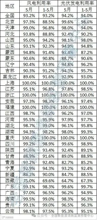 就2025年5月来看,全国有4个省的风电利用率低于90%,5个省的光伏利用率低于90%。其中,西藏的风、光项目利用率仅为75%和64.7%。具体如下表所示。