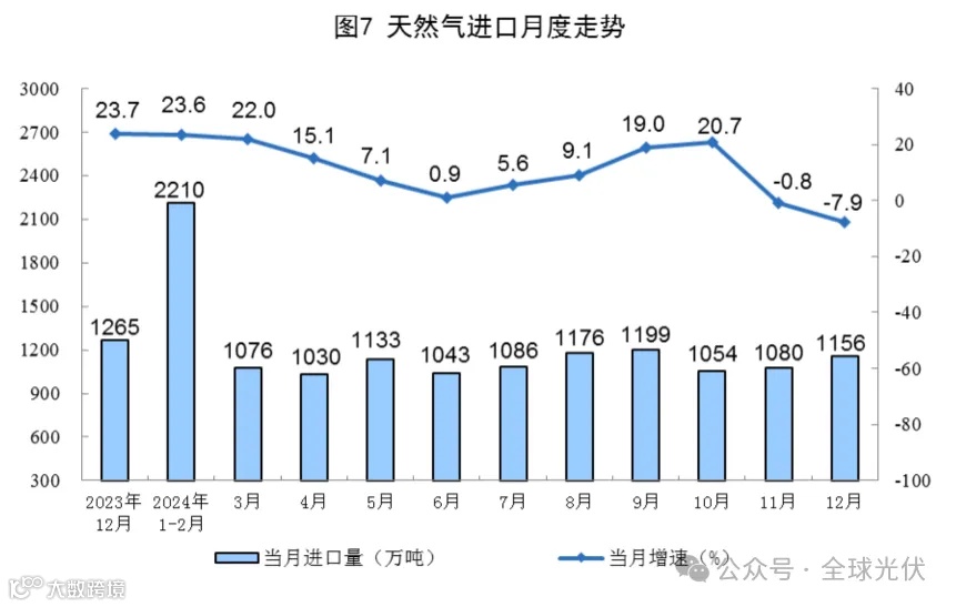 天然气生产稳步增长。12月份,规上工业天然气产量218亿立方米,同比增长3.6%,增速比11月份加快0.5个百分点;日均产量7.0亿立方米。进口天然气1156万吨,同比下降7.9%。