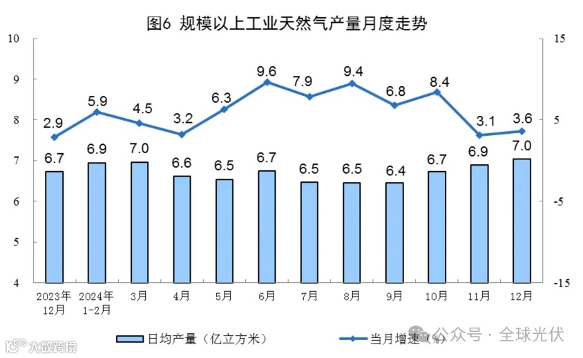 2024年12月份,规模以上工业(以下简称规上工业)原煤、原油、天然气、电力生产平稳增长。