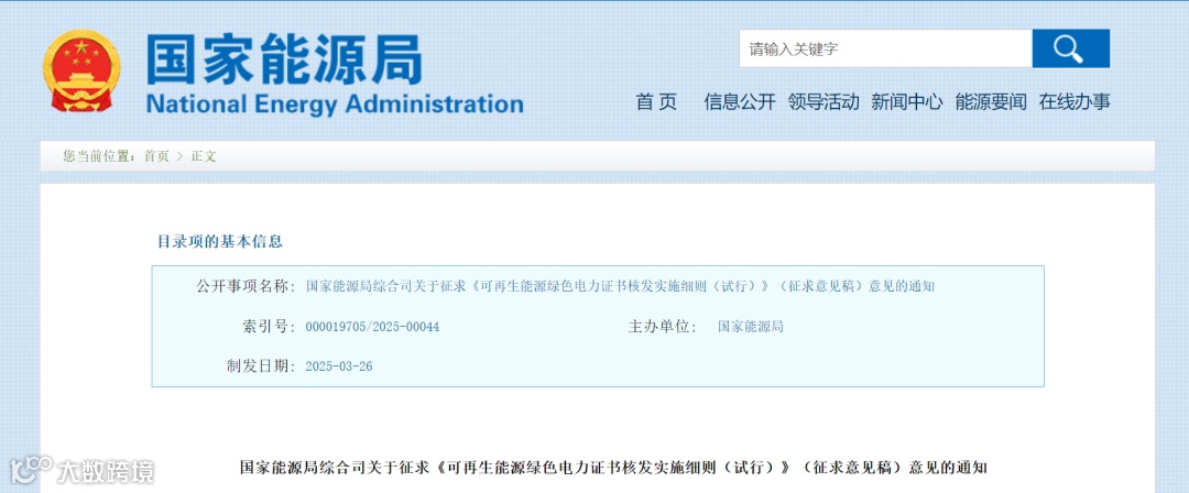 3月31日,国家能源局综合司就《可再生能源绿色电力证书核发实施细则(试行)》(征求意见稿)公开征求意见。