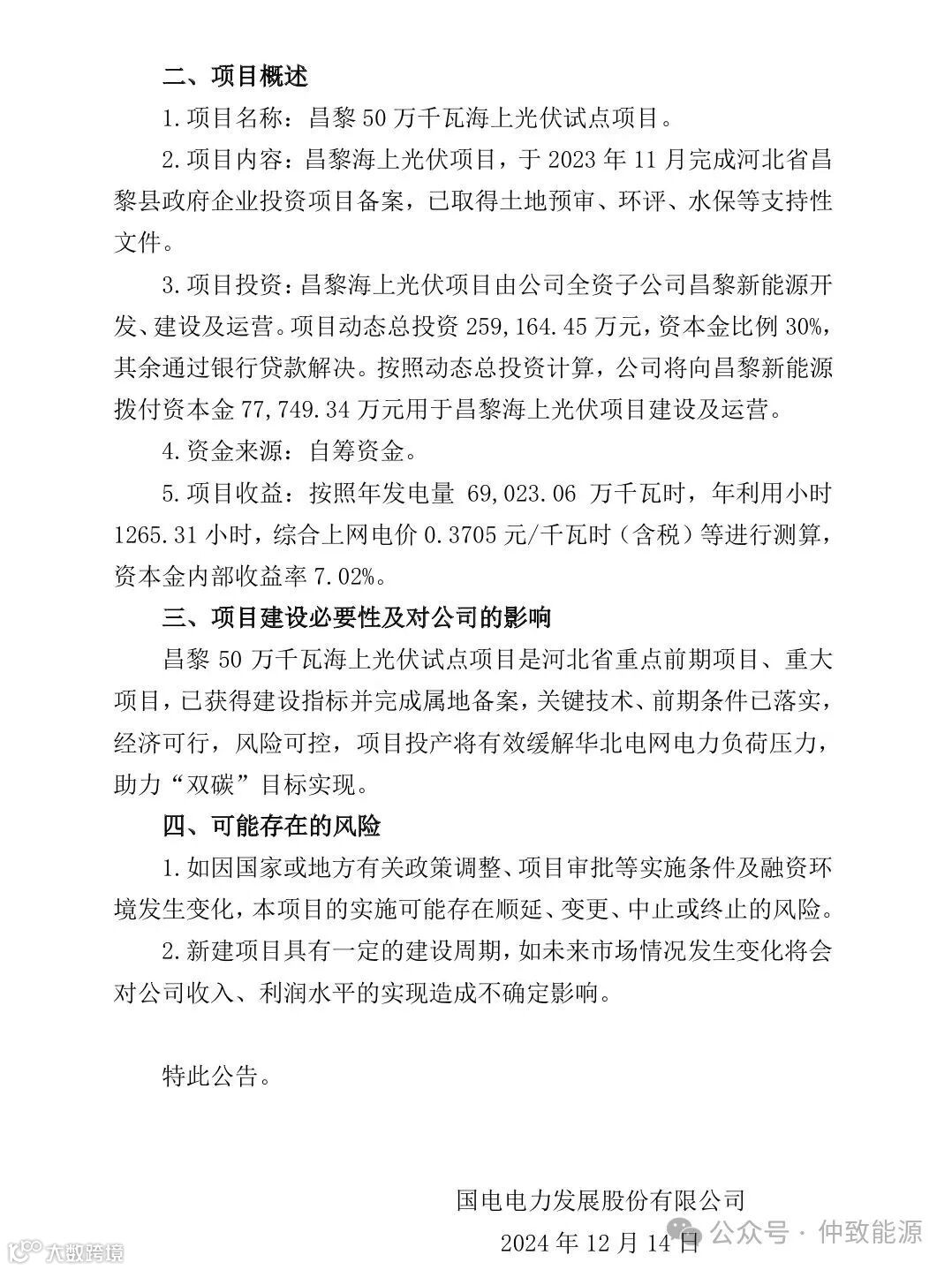 12月13日,国电电力发布《关于投资建设昌黎50万千瓦海上光伏试点项目的公告》。拟投建昌黎50万千瓦海上光伏试点项目,项目由全资子公司国电电力昌黎新能源开发有限公司开发、建设及运营。
