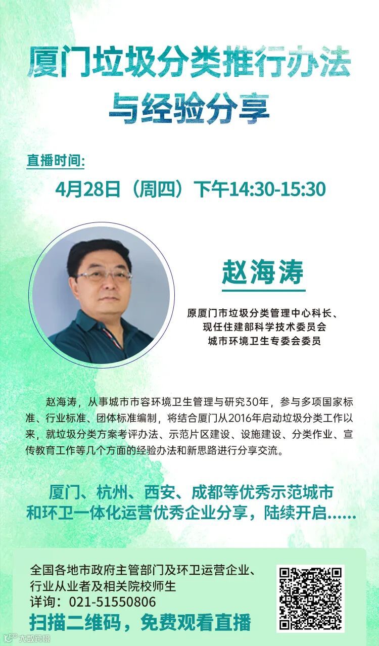 ■就 “厦门垃圾分类推行办法与经验分享”为主题做线上直播,直播时间为4月28日(周四)下午14:30-15:30,欢迎大家踊跃报名,扫码免费观看直播。