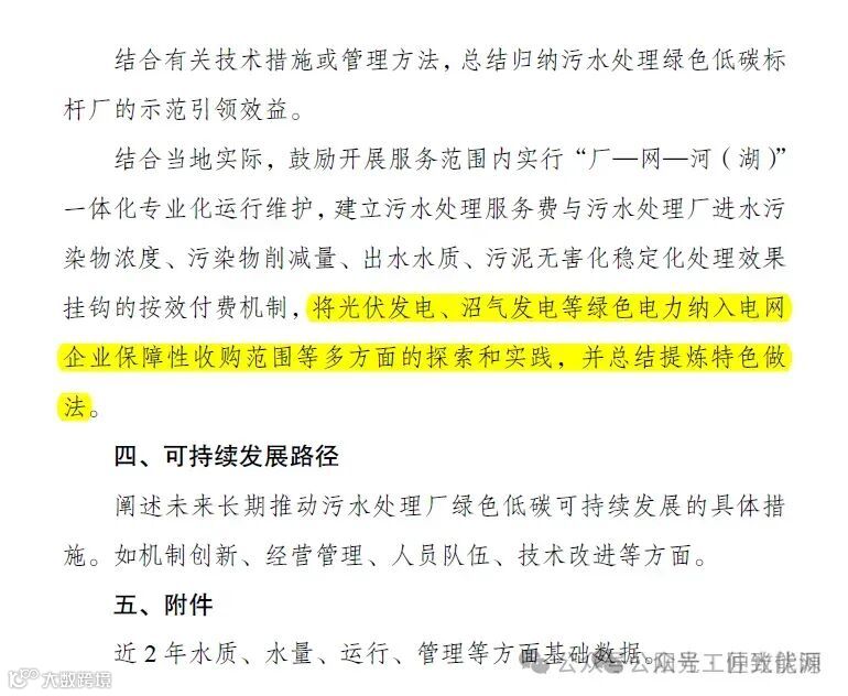 结合当地实际,鼓励开展服务范围内实行“厂—网—河(湖)”一体化专业化运行维护,建立污水处理服务费与污水处理厂进水污染物浓度、污染物削减量、出水水质、污泥无害化稳定化处理效果挂钩的按效付费机制,将光伏发电、沼气发电等绿色电力纳入电网企业保障性收购范围等多方面的探索和实践,并总结提炼特色做法。