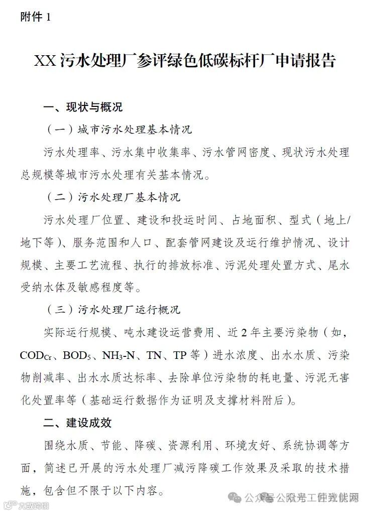 1、编制方案。各地组织相关部门根据拟参评污水处理厂实际运行情况,编制《XX污水处理厂参评绿色低碳标杆厂申请报告》(附件1),并附近2年污水处理厂运行基础数据和证明材料。申报参加遴选的污水处理厂,要求日处理量20000立方米以上,近一年进水BOD浓度达到100毫克/升以上或近三年增幅不低于10毫克/升,出水水质达标率、污泥无害化处置率均达到100%。