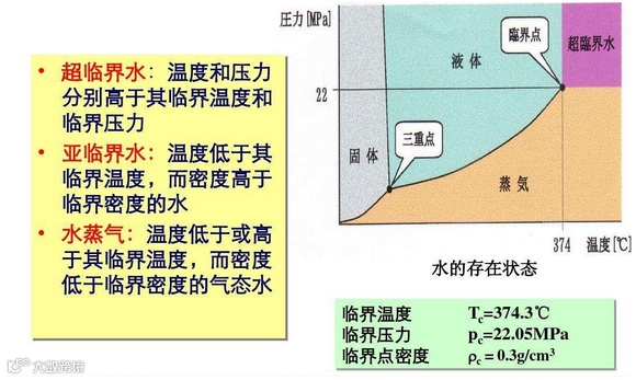 水的临界状态是指水的气、液两相平衡共存的极限热力状态,气态和液态平衡共存时的一个边缘状态。在此状态时,饱和液体与饱和蒸汽的热力状态参数相同,气液之间的分界面消失,因而没有表面张力,气化潜热为零。