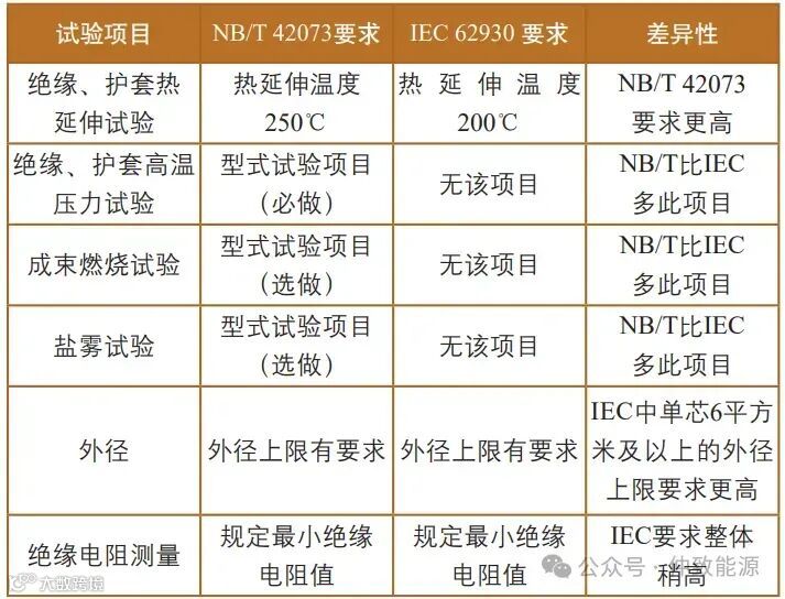 表2列举了NB/T 42073与IEC 62930的差异性,其中,NB/T 42073比IEC 62930多包含了绝缘(护套)高温压力试验、电缆成束燃烧试验及盐雾试验等检测项目,根据国内光伏发电系统的工况环境,NB/T42073更适合作为光伏电缆产品的依据标准。