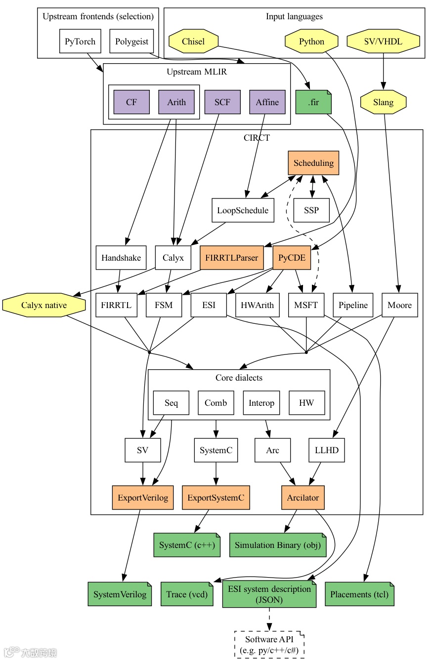 除此之外,在 CIRCT 项目中,也可对 RTL 级设计进行改进和仿真、实现高层级综合(High Level Synthesis)、从顺序代码的细粒度 CDFG(Control and Data Flow Graph)表示中提取数据流模型等等。