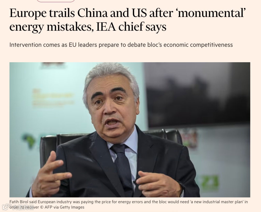 国际能源署署长法提赫·比罗尔接受英国《金融时报》采访,批评欧洲在能源政策上犯了“两个历史性的重大错误”,即依赖俄罗斯天然气和放弃核能,从而落后于中国和美国。比罗尔指出,欧洲工业现在正在为这些错误付出代价,欧盟需要“一个新的工业总体规划”才能复苏。