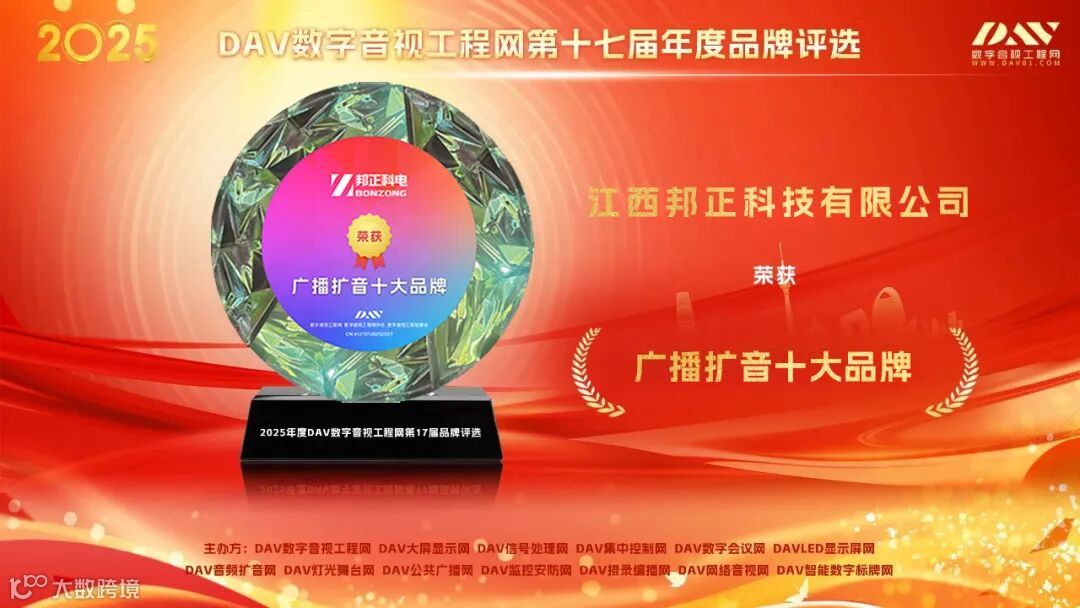 近日,由数字音视工程网主办的2025年度第17届“数字音视工程行业品牌评选”各大奖项名单正式揭晓。BONZONG邦正科电凭借持续的技术创新、完善的产业布局及稳健的市场表现,一举荣膺“2025年度广播扩音十大品牌”、“2025年度音视频系统方案知名品牌奖”两大奖项。