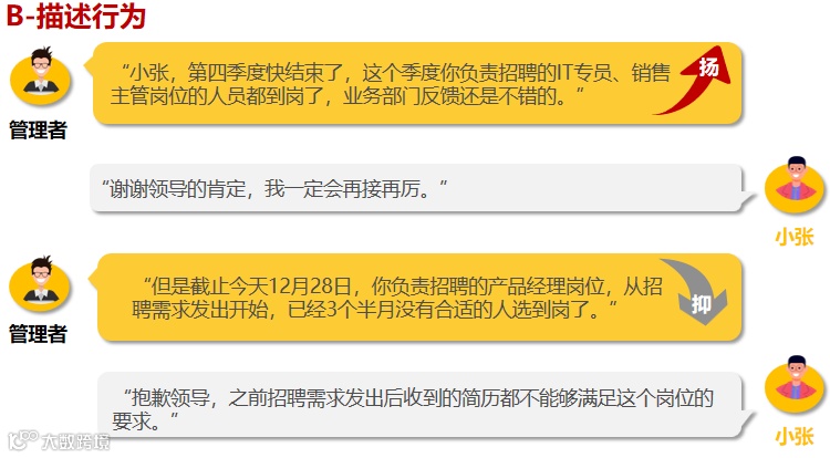 以上两种绩效面谈反馈技巧,大家可选择一种使用,当然也可以两者组合使用。下面举一个管理者预针对招聘专员在上个季度中“产品经理岗位到岗率未达标”事宜进行绩效反馈的小案例,其将BEST与汉堡包组合使用,供大家参考。
