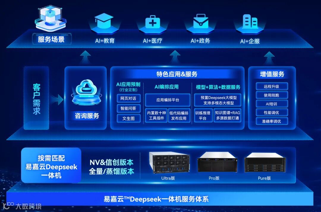 易嘉云™DeepSeek训推一体机,通过“软硬一体、开箱即用”的方式,助力不同行业客户打造面向本地部署的专属平台。一键引入DeepSeek生态服务,不仅具备本地化部署的核心优势,保障数据安全,更在AI基础设施能力和全栈AI PaaS能力上快人一步,快速满足政企、教育、医疗碎片化、长尾化行业需求,让智能化转型迅速落地行业。
