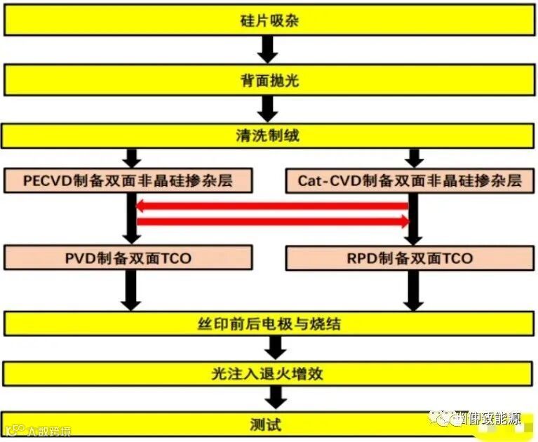 以N型单晶硅(C-Si)为衬底光吸收区,经过制绒清洗后,其正面依次沉积厚度为5-10nm的本征非晶硅薄膜(i-a-Si:H)和掺杂的P型非晶硅(P-a-Si:H),和硅衬底形成P-N异质结。硅片的背面又通过沉积厚度为5-10nm的i-a-Si:H和掺杂的N型非晶硅(n-a-Si:H)形成背表面场,双面沉积的透明导电氧化物薄膜(TCO),最后通过丝网印刷在两侧的顶层形成金属基电极,即为异质结电池的典型结构。