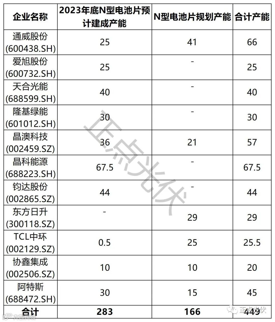 为顺应从P型向N型电池转变的行业发展趋势,国内主要电池厂商纷纷布局N型电池的扩产。2023年底国内电池片主要厂商的N型电池片建成产能预计将达到283GW,具体如下: