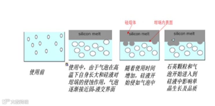 从质量方面看,石英坩埚内层由于与硅液直接接触,在拉晶过程中不断向硅液中溶解,并且坩埚透明层微气泡不断长大至破裂将向硅液中释放石英颗粒和微气泡,这些杂质又以微颗粒和微气泡的形式伴随硅液流遍整个硅熔体,直接影响到硅的成晶和单晶的质量。