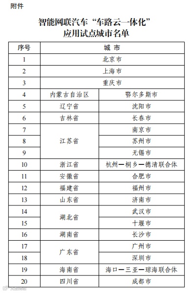 7月3日,工业和信息化部等五部门发布智能网联汽车“车路云一体化”应用试点城市名单,确定了20个城市(联合体)为首批“车路云一体化”试点城市,北京、上海、深圳、广州、武汉、重庆、南京、苏州、成都、杭州—桐乡—德清联合体等在列。