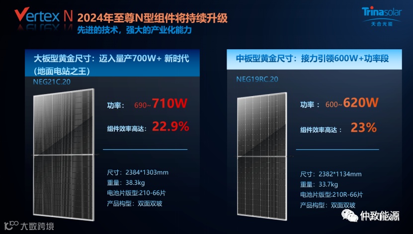 基于新一代N型i-TOPCon先进技术,天合光能已经实现了至尊N型700W+组件的量产。通过210产品技术和N型i-TOPCon技术的支持,210+N组件的产业化能力得到了全面提升。预计到2024年,至尊N型组件将持续升级,组件效率将达到23%,同时将实现至尊N型620W和710W组件的量产。
