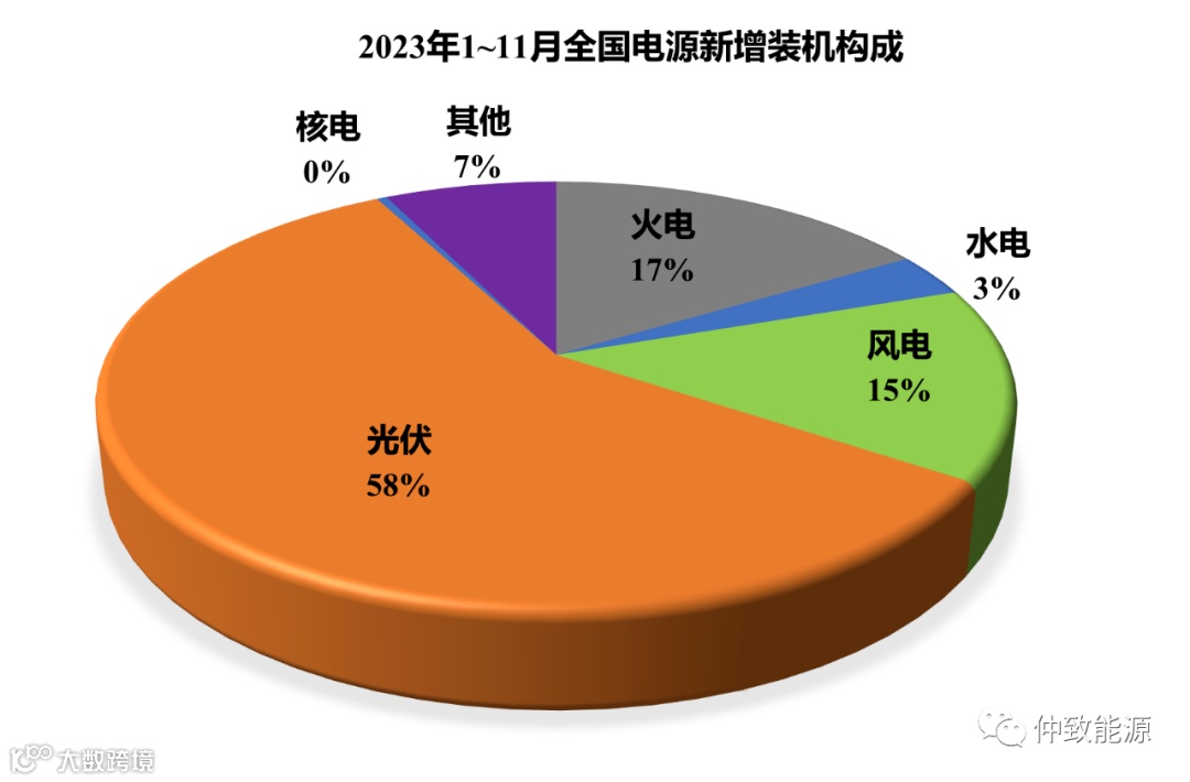 1~11月,光伏新增装机163.88GW,占全部电力新增装机58%。风电、光伏新增占比73%,具体如下图所示!