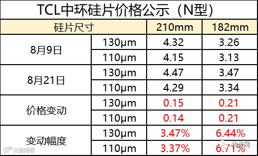 从公开报价看,182硅片价格涨幅更大,最高达6.71%,210硅片也有一定涨幅。